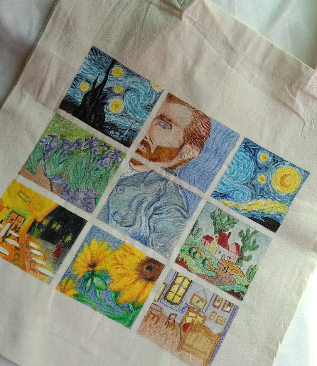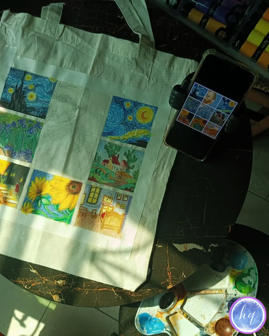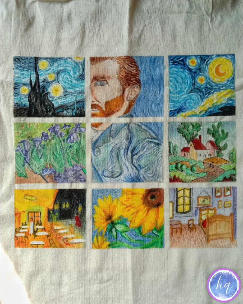 This hand-painted tote bag is a celebration of art, creativity, and individuality. Featuring a beautifully arranged grid of iconic, art-inspired scenes—from swirling night skies to sunflowers and cozy interiors—each detail is painted with care, making every bag truly unique.